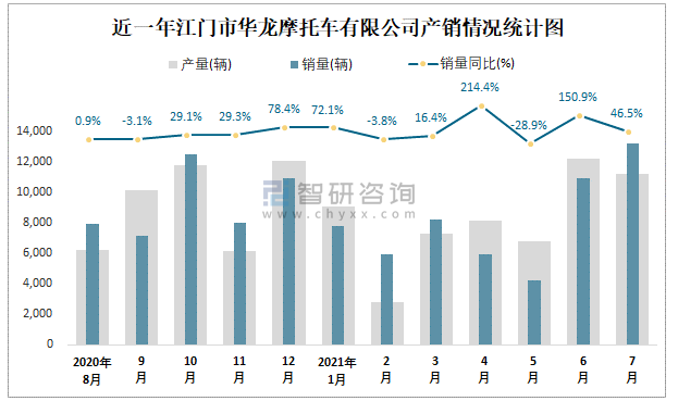 近一年江門市華龍摩托車有限公司產(chǎn)銷情況統(tǒng)計圖