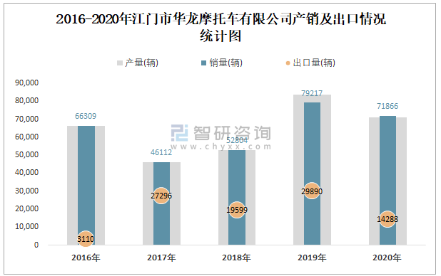 2016-2020年江門市華龍摩托車有限公司產(chǎn)銷及出口情況統(tǒng)計圖