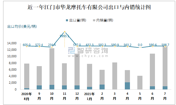 根據(jù)中國汽車工業(yè)(摩托車)產(chǎn)銷快訊數(shù)據(jù)統(tǒng)計可知:2021年7月中國摩托車產(chǎn)量總計為1721567輛,同比增長5.6%,銷量總計為1721887輛,同比增長4.26%,產(chǎn)銷率約為100.02%,清倉庫存-320輛,其中總計出口量為723084輛,內(nèi)銷998803輛,出口均價約為633.62美元/輛。江門市華龍摩托車有限公司作為廣東本土車企的摩托車企業(yè)之一,7月銷量相較于同類型車企,排名處于中等水平,且以內(nèi)銷為主。