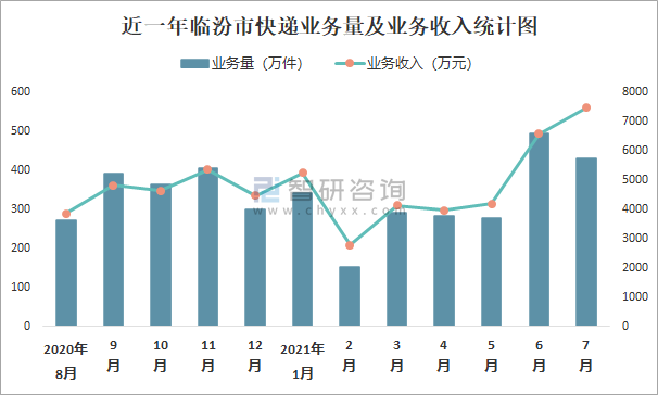 近一年臨汾市快遞業務量及業務收入統計圖