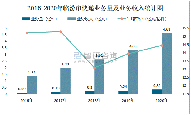 2016-2020年臨汾市快遞業務量及業務收入統計圖