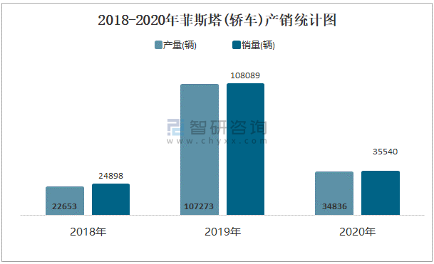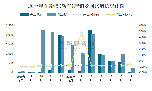 根據中國汽車工業協會數據可知:2021年7月菲斯塔(轎車)產量為17輛,同比下降96.8%,銷量為240輛,同比下降50.6%,當月產銷率為1411.76%;2021年1-7月菲斯塔(轎車)累計產量為4576輛,同比下降86%,累計銷量為7229輛,同比下降75.2%,累計產銷率為157.98%;2018-2020年菲斯塔(轎車)產銷量均在2019年達到最高值,此后大幅度下降,且近3年總銷量大于總產量,清倉庫存3765輛。