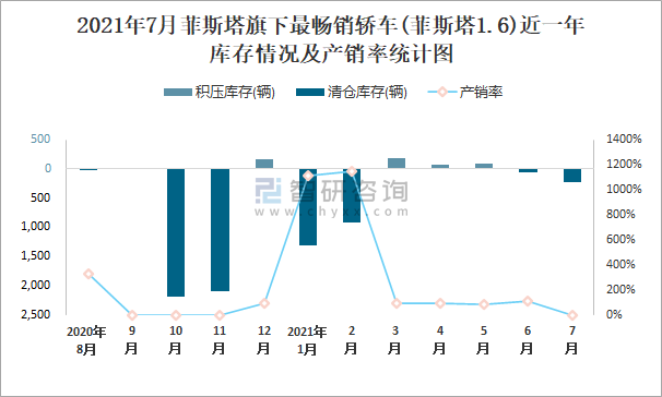 2021年7月菲斯塔旗下最暢銷車(菲斯塔1.6)近一年庫存情況及產銷率統計圖