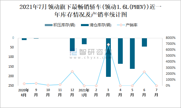 2021年7月領動旗下最暢銷車(領動1.6L(PHEV))近一年庫存情況及產銷率統計圖