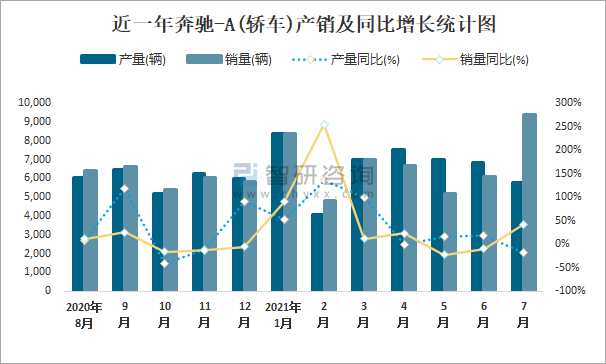 近一年奔馳-A(轎車)產銷及同比增長統計圖