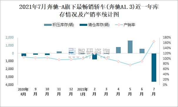 2021年7月奔馳-A旗下最暢銷車(奔馳A1.3)近一年庫存情況及產銷率統計圖