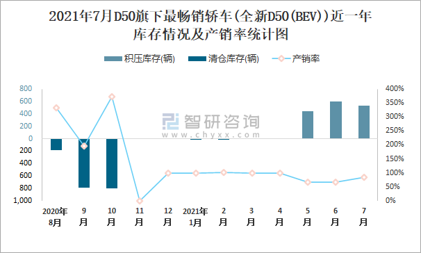 2021年7月D50旗下最暢銷車(全新D50(BEV))近一年庫存情況及產銷率統計圖