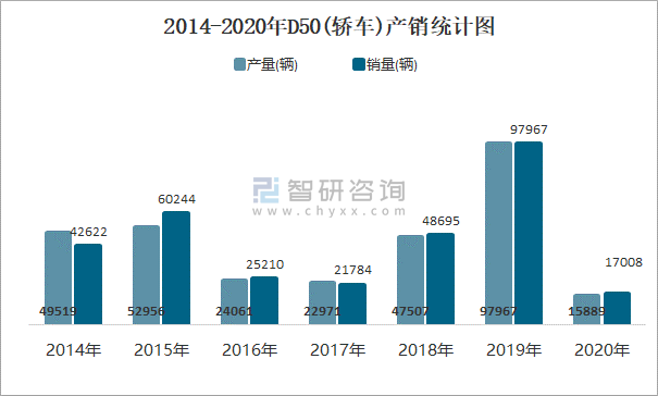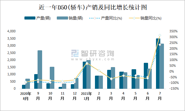 根據中國汽車工業協會數據可知:2021年7月D50(轎車)產量為3486輛,同比增長234.6%,銷量為3130輛,同比增長318.5%,當月產銷率為89.79%;2021年1-7月D50(轎車)累計產量為11809輛,同比下降15.1%,累計銷量為10927輛,同比下降1.9%,累計產銷率為92.53%;2014-2020年D50(轎車)產銷量均在2019年達到最高值,此后大幅度下滑,且近7年總銷量大于總產量,清倉庫存2660輛。