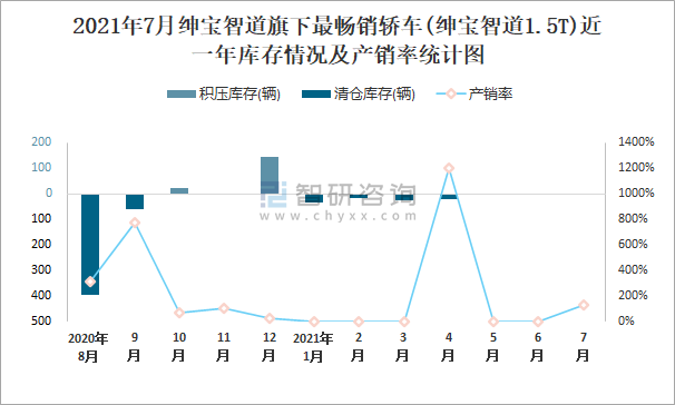根據中國汽車工業協會數據統計可知:2021年7月紳寶智道(轎車)旗下只有1款紳寶智道1.5T轎車在銷售;近一年紳寶智道1.5T共清倉庫存398輛,其產銷率存在一定幅度波動,2021年4月產銷率最高(1200%),清倉庫存22輛,2020年12月產銷率偏低(27.5%),積壓庫存145輛。