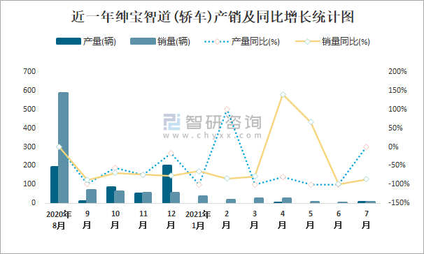 近一年紳寶智道(轎車)產銷及同比增長統計圖