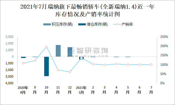 2021年7月瑞納旗下最暢銷車(全新瑞納1.4)近一年庫存情況及產銷率統計圖