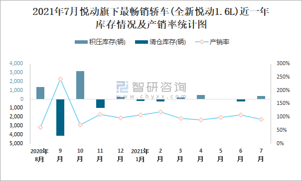 2021年7月悅動旗下最暢銷車(全新悅動1.6L)近一年庫存情況及產(chǎn)銷率統(tǒng)計圖