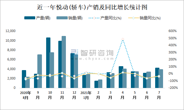 近一年悅動(轎車)產(chǎn)銷及同比增長統(tǒng)計圖