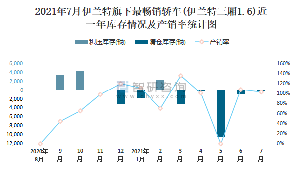 2021年7月伊蘭特旗下最暢銷車(伊蘭特三廂1.6)近一年庫存情況及產(chǎn)銷率統(tǒng)計圖