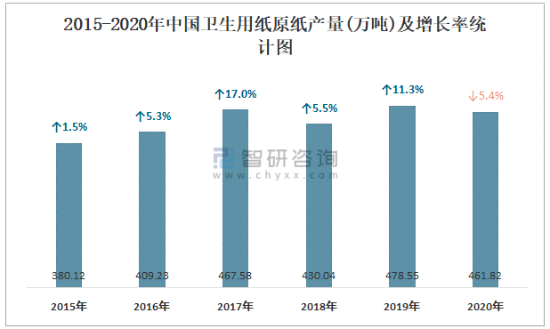 2015-2020年中國衛生用紙原紙產量及增長率統計圖