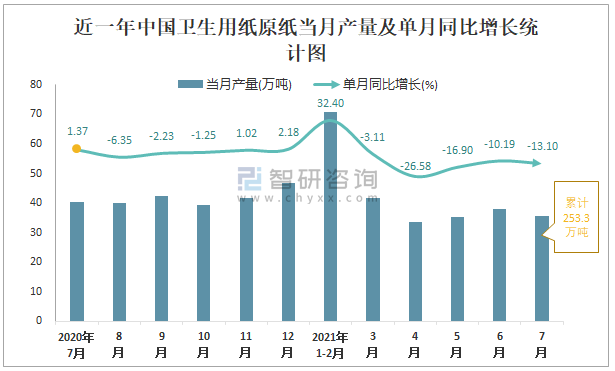 根據國家統計局數據顯示:2021年7月中國衛生用紙原紙產量為35.6萬噸,同比下降13.1%;2021年1-7月中國衛生用紙原紙累計產量為253.3萬噸,同比下降5.17%;2015-2020年中國衛生用紙原紙產量2019年達到最高,次年有所下滑。