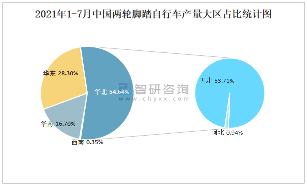 2021年1-7月中國兩輪腳踏自行車產量大區占比統計圖