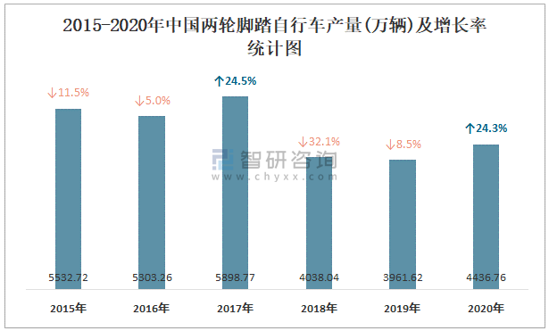 2015-2020年中國兩輪腳踏自行車產量及增長率統計圖