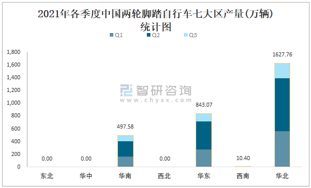 2021年各季度中國兩輪腳踏自行車七大區產量統計圖