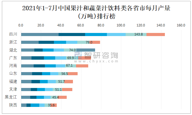 2021年1-7月中國果汁和蔬菜汁飲料類各省市每月產量排行榜