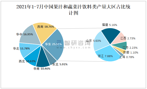 2021年1-7月中國果汁和蔬菜汁飲料類產量大區占比統計圖