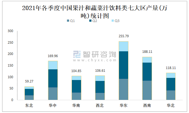 2021年1-7月中國果汁和蔬菜汁飲料類產量為1002.7萬噸 華東地區產量最高(占比25.51%)