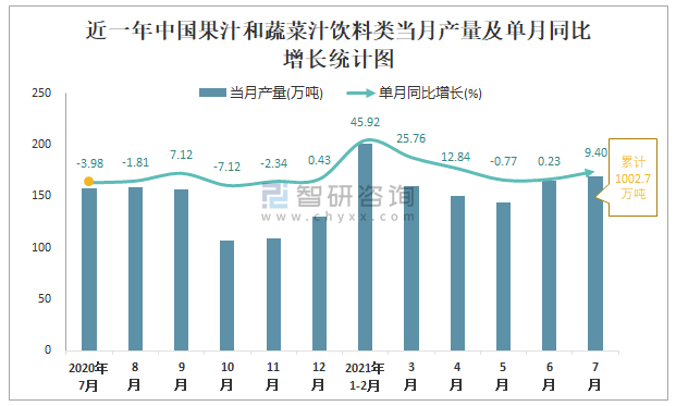 根據國家統計局數據顯示:2021年7月中國果汁和蔬菜汁飲料類產量為169萬噸,同比增長9.4%;2021年1-7月中國果汁和蔬菜汁飲料類累計產量為1002.7萬噸,同比增長15.81%;2015-2020年中國果汁和蔬菜汁飲料類產量2016年達到最高,此后總體呈現下降趨勢。