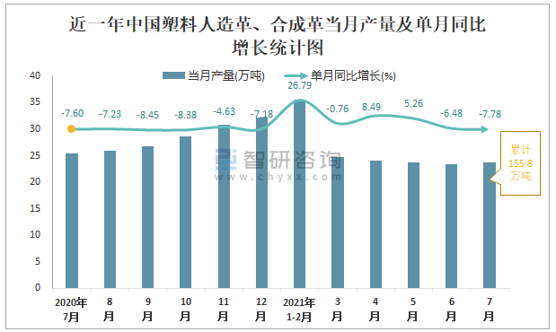 根據國家統計局數據顯示:2021年7月中國塑料人造革、合成革產量為23.7萬噸,同比下降7.78%;2021年1-7月中國塑料人造革、合成革累計產量為155.8萬噸,同比下降11.7%;2015-2020年中國塑料人造革、合成革產量2018年跌至最低,次年有所回升。