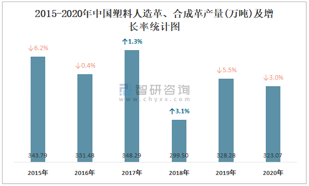 2015-2020年中國塑料人造革、合成革產量及增長率統計圖
