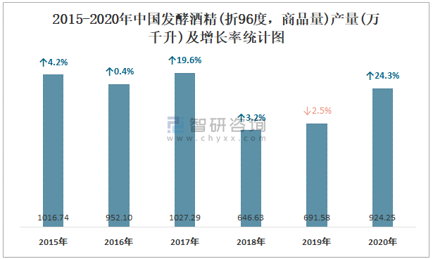 2015-2020年中國發酵酒精(折96度,商品量)產量及增長率統計圖