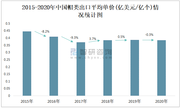 2015-2020年中國帽類出口平均單價(億美元/億個)情況統計圖