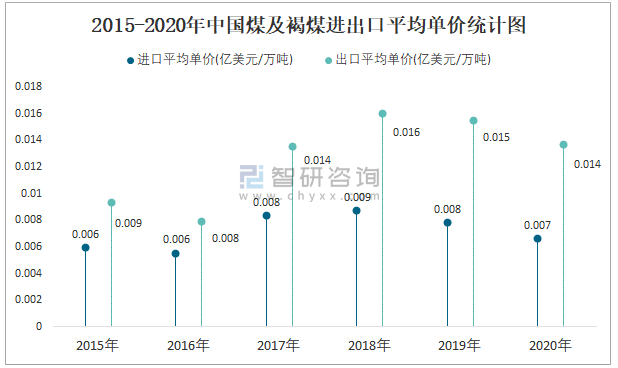 2015-2020年中國(guó)煤及褐煤進(jìn)出口平均單價(jià)統(tǒng)計(jì)圖