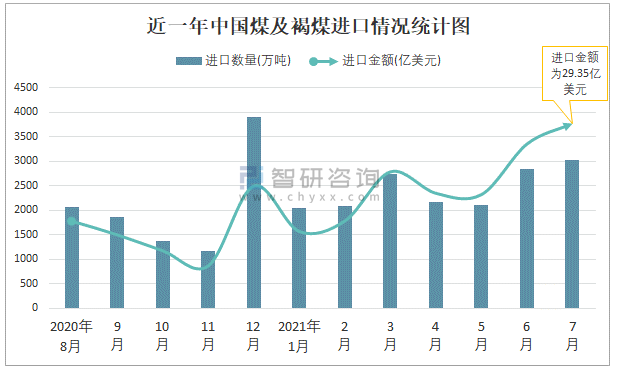 根據(jù)中國(guó)海關(guān)數(shù)據(jù)顯示:2021年7月中國(guó)煤及褐煤進(jìn)口數(shù)量為3018萬噸,同比增長(zhǎng)16.4%,進(jìn)口金額為29.35億美元,同比增長(zhǎng)69.5%,2021年7月中國(guó)煤及褐煤出口數(shù)量為8萬噸,同比下降83.1%,出口金額為0.21億美元,同比下降60.1%;2021年1-7月中國(guó)煤及褐煤進(jìn)口數(shù)量為16974萬噸,進(jìn)口金額為140.17億美元,出口數(shù)量為134萬噸,出口金額為2.18億美元。