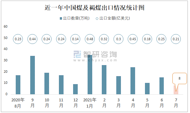 近一年中國(guó)煤及褐煤出口情況統(tǒng)計(jì)圖