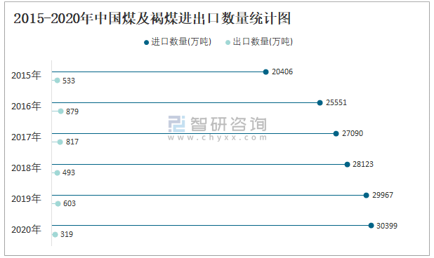 2015-2020年中國(guó)煤及褐煤進(jìn)出口數(shù)量統(tǒng)計(jì)圖