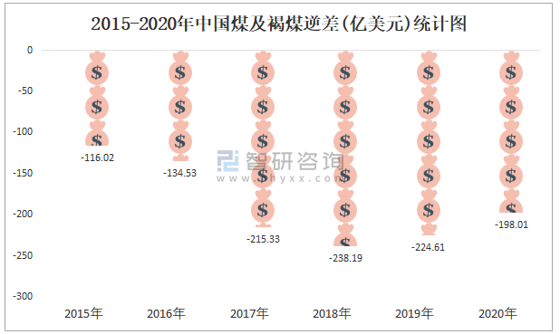 2015-2020年中國(guó)煤及褐煤逆差(億美元)統(tǒng)計(jì)圖