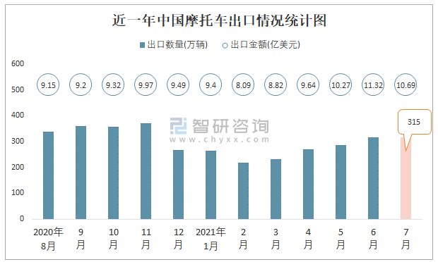 根據中國海關數據顯示:2021年7月中國摩托車出口數量為315萬輛,同比增長7.5%,出口金額為10.69億美元,同比增長32.1%;2021年1-7月中國摩托車,出口數量為1900萬輛,出口金額為68.22億美元。