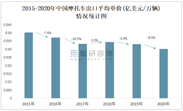 2015-2020年中國摩托車出口平均單價(億美元/萬輛)情況統計圖