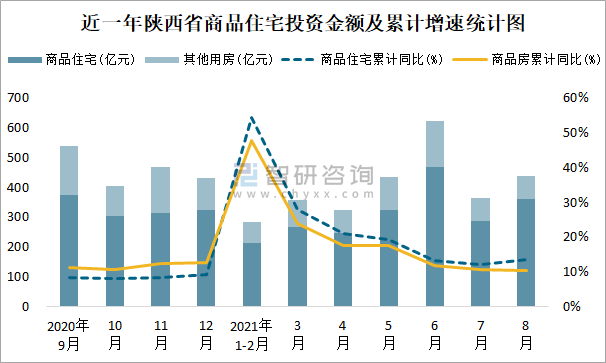 根據國家統計局數據統計可知:2021年8月陜西省房地產開發投資商品房投資金額為438.84億元(其中商品住宅為360.46億元,辦公樓、商業營業用房等其他用房78.38億元);2021年1-8月陜西省房地產開發投資商品住宅累計投資金額為2165.74億元,投資金額累計同比增長13.4%。