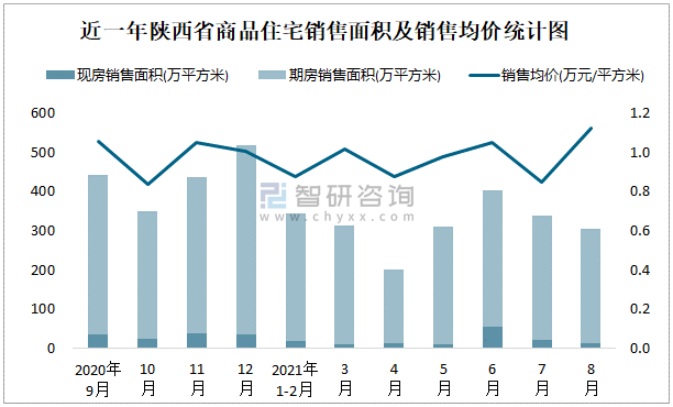 根據國家統計局數據可知:2021年8月陜西省商品住宅銷售面積為305.34萬平方米(其中銷售現房12.35萬平方米,期房292.99萬平方米),銷售額為343.3億元,銷售均價約為1.12萬元/平方米;2021年1-8月陜西省商品住宅累計銷售面積為2216.64萬平方米,銷售面積累計同比增長2.9%,累計銷售額為2156.94億元,銷售額累計同比增長7.1%;近一年陜西省商品住宅銷售均價2020年10月跌至最低值,此后總體呈現上升趨勢,期房銷售面積遠高于現房銷售面積。