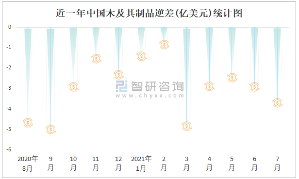 近一年中國木及其制品逆差(億美元)統(tǒng)計圖