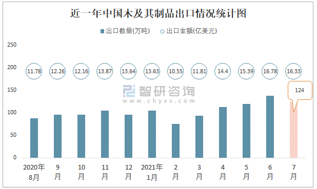 根據(jù)中國海關(guān)數(shù)據(jù)顯示:2021年7月中國木及其制品進口數(shù)量為679萬噸,同比下降7.7%,進口金額為20.04億美元,同比增長9.8%,2021年7月中國木及其制品出口數(shù)量為124萬噸,同比增長34.9%,出口金額為16.33億美元,同比增長31.6%;2021年1-7月中國木及其制品進口數(shù)量為4433萬噸,進口金額為118.01億美元,出口數(shù)量為766萬噸,出口金額為98.87億美元。