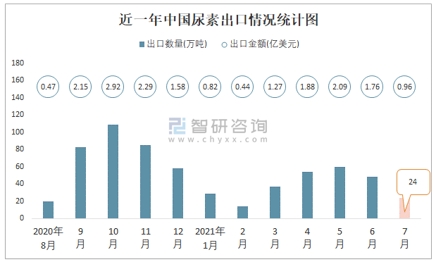根據(jù)中國海關(guān)數(shù)據(jù)顯示:2021年7月中國尿素出口數(shù)量為24萬噸,同比增長34.1%,出口金額為0.96億美元,同比增長118.1%;2021年1-7月中國尿素,出口數(shù)量為267萬噸,出口金額為9.22億美元。