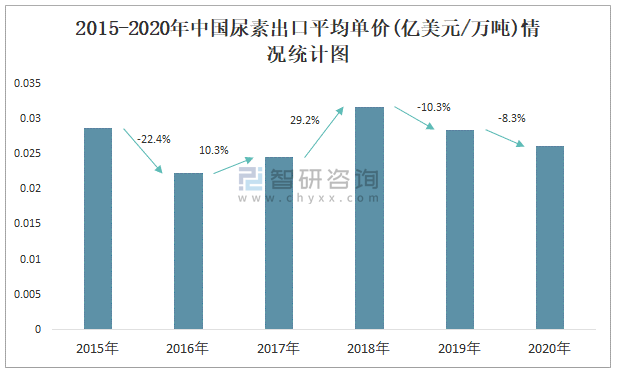 2015-2020年中國尿素出口平均單價(億美元/萬噸)情況統(tǒng)計圖
