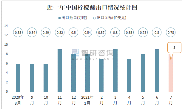 根據中國海關數據顯示:2021年7月中國檸檬酸出口數量為8萬噸,同比增長30.8%,出口金額為0.78億美元,同比增長100.3%;2021年1-7月中國檸檬酸,出口數量為57萬噸,出口金額為4.86億美元。