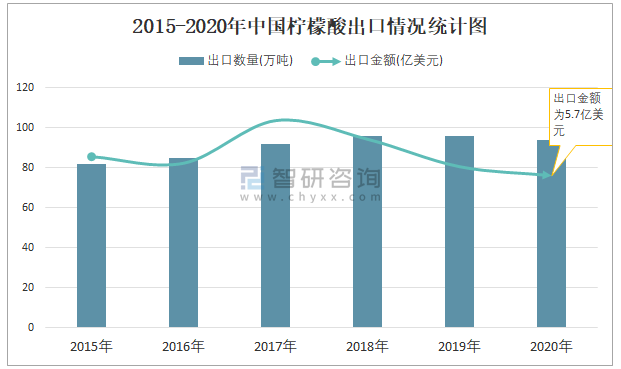 根據中國海關數據顯示:2015-2020年中國檸檬酸出口數量2018年和2019年均達到最高值,此后有所下降,出口金額2017年達到最大值,此后逐年遞減;2015-2020年中國檸檬酸出口平均單價2017年增長速度最快,并達到最大值,而2019年中國檸檬酸出口平均單價下降速度最快,下滑了14.5%。
