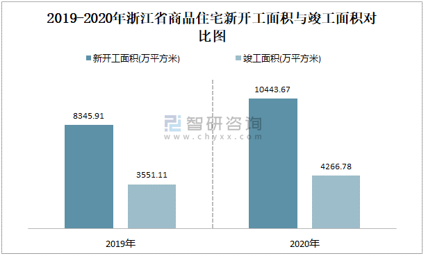 2019-2020年浙江省商品住宅新開工面積與竣工面積對比圖