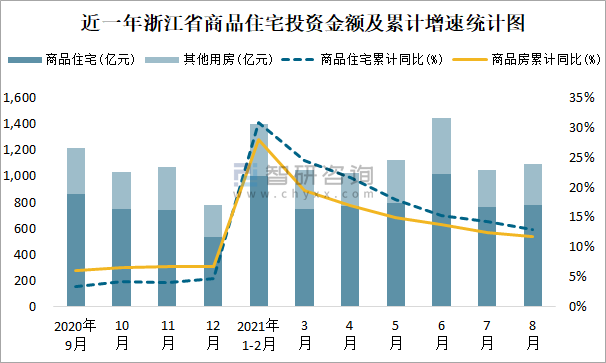 根據國家統計局數據統計可知:2021年8月浙江省房地產開發投資商品房投資金額為1093.43億元(其中商品住宅為778.89億元,辦公樓、商業營業用房等其他用房314.54億元);2021年1-8月浙江省房地產開發投資商品住宅累計投資金額為5868.03億元,投資金額累計同比增長12.9%。