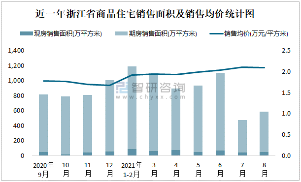 根據國家統計局數據可知:2021年8月浙江省商品住宅銷售面積為584.59萬平方米(其中銷售現房47.71萬平方米,期房536.88萬平方米),銷售額為1223.12億元,銷售均價約為2.09萬元/平方米;2021年1-8月浙江省商品住宅累計銷售面積為6285.53萬平方米,銷售面積累計同比增長16.3%,累計銷售額為12491.72億元,銷售額累計同比增長29.2%;近一年浙江省商品住宅銷售均價2021年7月達到最高值,此后有所下滑,期房銷售面積遠高于現房銷售面積。