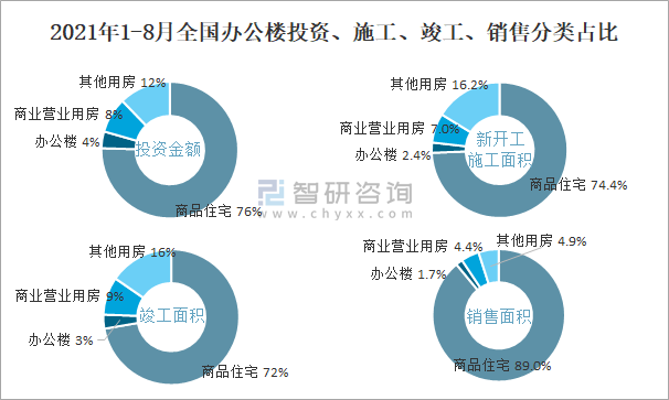 根據國家統計局數據統計可知:2021年1-8月全國房地產開發企業在辦公樓中投資金額占比為4%,辦公樓的新開工面積與竣工面積所占比重差異不大,從銷售面積來看,辦公樓銷售面積占比少于商業營業用房銷售面積占比。